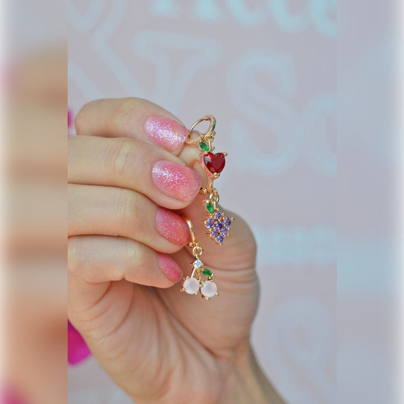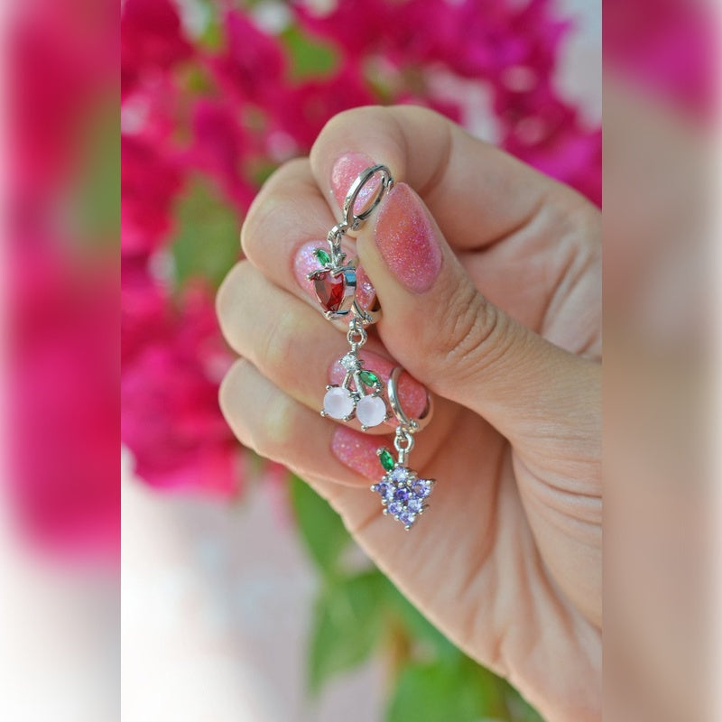 This vibrant earring set is made from original rhodium-plated xuping and features colorful fruit details. Each earring has an inner diameter of 8 mm and is adorned with zircon stones. Sold as a set of three single earrings, they are durable with minimized color change, ensuring long-lasting shine. Suitable for daily wear as long as they are kept away from excessive moisture and chemicals. Not recommended for shower use. Triple Set Cherry Grape Apple Earring Colourful Fruits Earring Triple Earring Set Fruit Earrings Set White Cherry Gold Silver