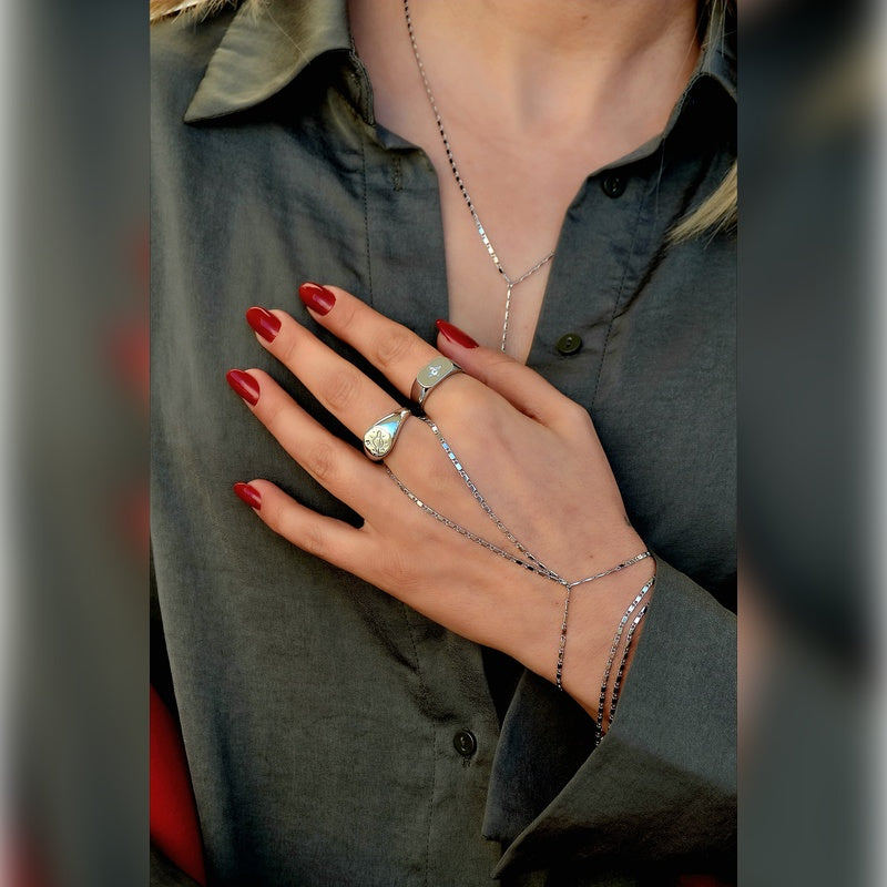 It is hypoallergenic and features a Y-shaped design. Its shimmering appearance adds elegance to outfits and complements low-cut clothing styles.